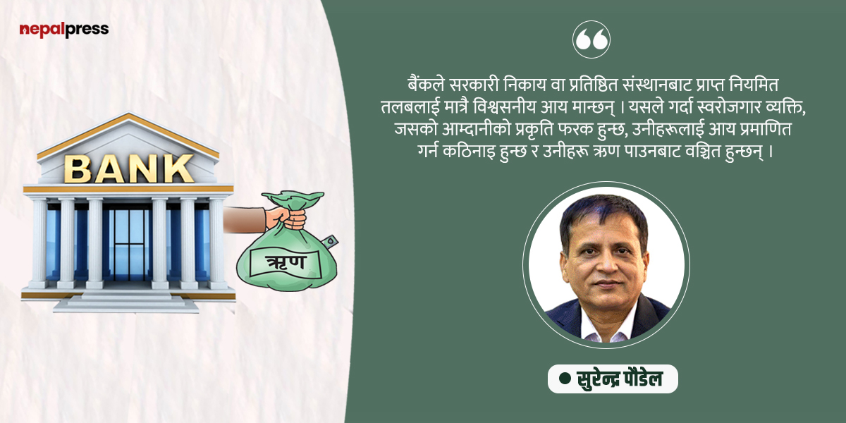 साना व्यवसायी, स्वतन्त्र पेशेवर र अनौपचारिक क्षेत्रका व्यक्ति नेपालको अर्थतन्त्रको महत्वपूर्ण हिस्सा हुन् । तर, बैंकको ऋण नीति उनीहरूप्रति पक्षपातपूर्ण छ ।